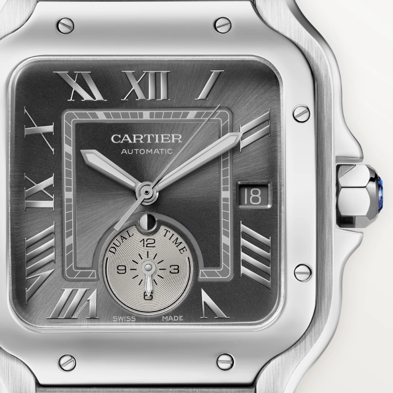 1904, Louis Cartier granted the wish of the famous Brazilian aviator Alberto Santos Dumont: to be able to tell time while flying. The birth of one of the first ever wristwatches sealed the bonds of friendship between these two pioneers. The rounded angles of the dial, the seamless curve of the horns, and the exposed screws made for an iconic watch that would inspire countless reinterpretations. Product Description: Santos de Cartier Dual Time watch Large model Mechanical movement Dual time zone Steel case 7-sided crown with a synthetic faceted blue spinel Satin-finish anthracite gray sunray-brushed dial Second time zone display with an additional hour hand in a counter and a day/night indicator Rhodium-finish polished steel sword-shaped hands with luminescent material Sapphire crystal Steel bracelet with SmartLink adjustment system Second strap in gray alligator leather With interchangeable folding steel buckle Both are fitted with the QuickSwitch interchangeable system Case width: 40.2 mm Thickness: 10.01 mm Water-resistant to 10 bar (approx. 100 meters)